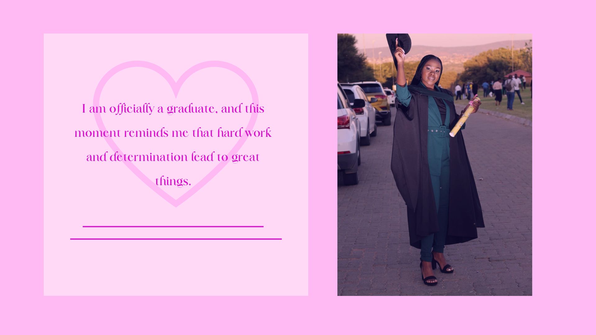 I wanted to see this through, and eventually, I did manage to graduate. I’ve never been prouder of myself. Despite everything I went through, I made it to the finish line. It was one of the happiest moments of my life—a huge personal victory. The journey was blurry, but it took so much strength to get there, and I did. Looking back, I realize that I had been underestimating myself. The more I pushed through, the more I discovered that things weren’t as difficult as I had imagined—they just required patience and effort. I know some people prefer to work alone, but don’t be afraid to ask for help. You might be surprised by how much support is out there and how much you can learn from others. It took me a while to realize this, but it was worth it.